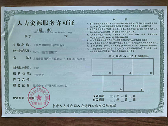 一、上海人力資源服務(wù)許可證辦理流程 1.前期準(zhǔn)備 · 注冊(cè)資本:不低于10萬元(認(rèn)繳制),如需辦理勞務(wù)派遣經(jīng)營(yíng)許可,需要實(shí)繳注冊(cè)資本不低于200萬元。 · 經(jīng)營(yíng)場(chǎng)所:商用辦公場(chǎng)地,面積不少于50平方米,需提供房產(chǎn)證或租賃合同。 · 人員要求:至少3名專職工作人員,需繳納社保,部分區(qū)域要求具備人力資源相關(guān)資質(zhì)。 · 管理制度:制定服務(wù)流程、收費(fèi)標(biāo)準(zhǔn)、應(yīng)急預(yù)案等制度文本。 2.網(wǎng)上申報(bào) 登錄“上海一網(wǎng)通辦”平臺(tái),搜索“人力資源服務(wù)許可”,在線填寫申請(qǐng)表并上傳材料,包括營(yíng)業(yè)執(zhí)照、人員資質(zhì)證明、場(chǎng)地證明等。 3.現(xiàn)場(chǎng)核查 審批部門上門核查辦公場(chǎng)所、人員在崗情況及設(shè)施設(shè)備是否與申報(bào)材料一致。 4.審批發(fā)證 審核通過后頒發(fā)《人力資源服務(wù)許可證》,有效期一般為5年。 二、上海人力資源服務(wù)許可證辦理費(fèi)用 許可證辦理本身不收費(fèi),但需承擔(dān)場(chǎng)地租賃、人員社保、制度建設(shè)等合規(guī)成本。若委托專業(yè)機(jī)構(gòu)代辦,費(fèi)用約6000-15000元。 三、人力資源服務(wù)許可證作用 1.合法經(jīng)營(yíng)基礎(chǔ):從事職業(yè)中介、獵頭、人力資源外包等業(yè)務(wù)的法定資質(zhì),無證經(jīng)營(yíng)面臨高額罰款。 2.業(yè)務(wù)合作門檻:多數(shù)企業(yè)合作、政府項(xiàng)目投標(biāo)要求合作方具備該證。 3.行業(yè)信譽(yù)背書:體現(xiàn)專業(yè)性和合規(guī)性,增強(qiáng)客戶信任。 4.拓展業(yè)務(wù)范圍:可開展靈活用工、跨境人力資源服務(wù)等新興業(yè)務(wù)。 注意事項(xiàng) · 場(chǎng)地需為實(shí)際辦公地址,虛擬地址或住宅不可用。(如果沒有實(shí)際辦公場(chǎng)地,歡迎掃碼咨詢添加客服,提供辦理人力資源服務(wù)許可證地址) · 人員社保需連續(xù)繳納,避免“掛靠”風(fēng)險(xiǎn)。 · 各區(qū)政策有差異,建議提前咨詢當(dāng)?shù)厝松缇。建議提前規(guī)劃,確保材料齊全合規(guī),必要時(shí)可委托玖邀開業(yè)專業(yè)機(jī)構(gòu)代辦以提高效率。 |